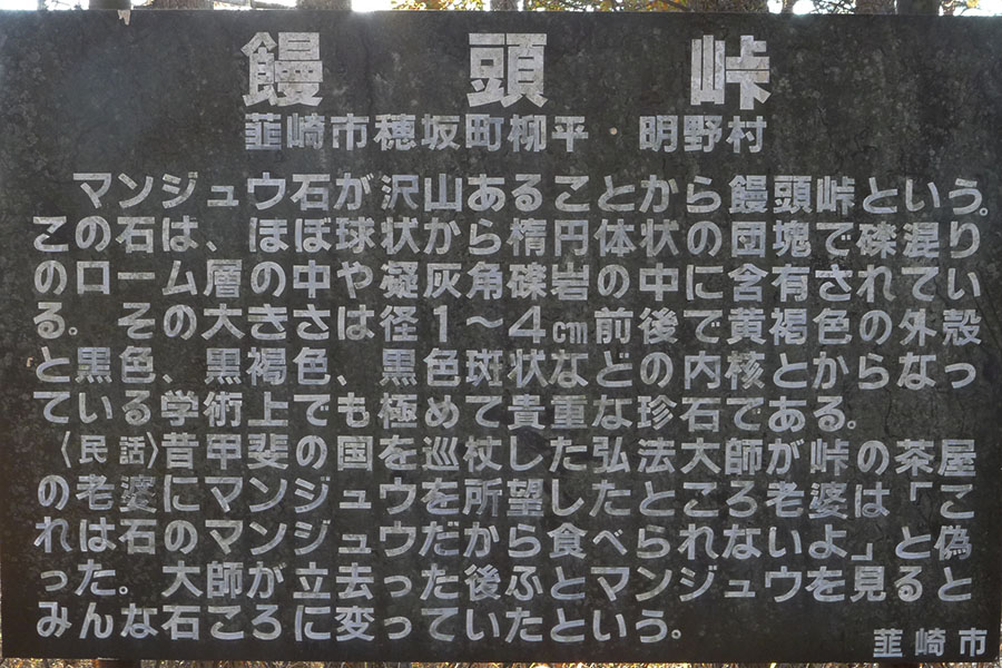 茅ヶ岳南麓の饅頭峠(写真2)には、直径1〜4cmの球状で中心に餡が入ったような団塊が産出し(写真1)、これらはその形態からマンジュウ石と呼ばれている(写真3)。