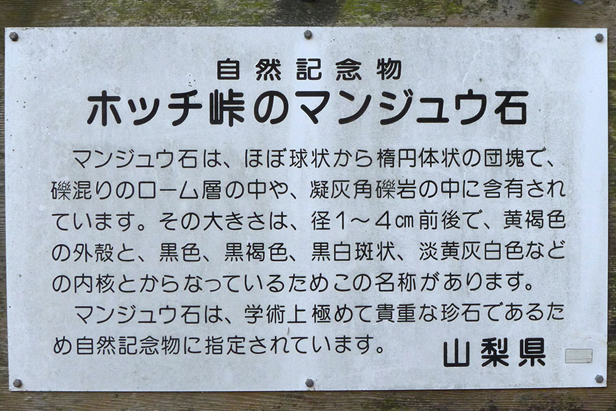 饅頭峠の東の、韮崎市と甲斐市の境界にあるホッチ峠にもマンジュウ石が産出し、こちらは山梨県の自然記念物に指定されている(写真4)。