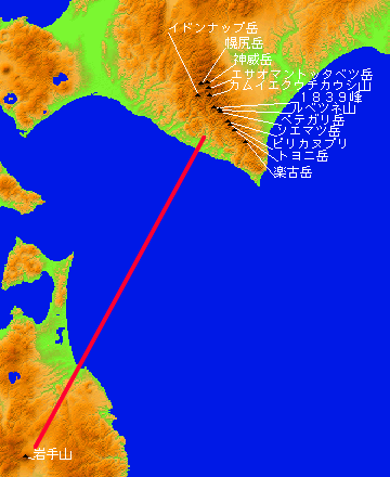 他の展望図とは異なり、ここでは気差係数を15.15にして描いています。比較のため、通常の気差係数14.74で描いた岩手山からの展望図を下に並べました。気差係数14.74では、岩手山からは幌尻岳をはじめ、イドンナップ岳や1823峰などが見えません。もしも実際に、幌尻岳から岩手山、あるいは岩手山から幌尻岳が見えたら、国内最遠望記録となることは間違いないでしょう。