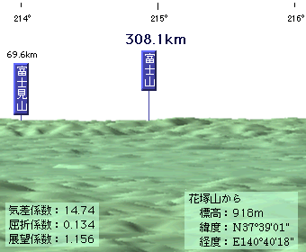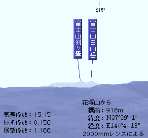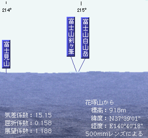 計算上は見えることになりますが、富士山から花塚山を認めることはもちろん、花塚山から富士山を見つけることもほとんど不可能でしょう。気差係数を15.15にしたときの500mmレンズと2000mmレンズによる花塚山からの富士山の図も掲載しておきます。これでも500mmレンズで富士をとらえることは無理かもしれません。