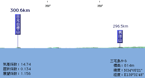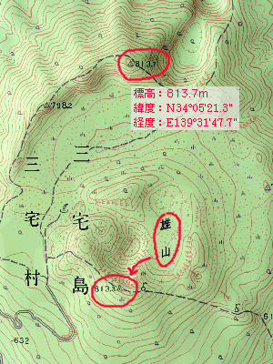三宅島は通常山頂とされる雄山山頂三角点からでは、北側の外輪山に遮られて本州方面は見えません。下図に示すように、三宅島の展望地点は雄山山頂三角点の北の外輪山の813.7m三角点としました。距離もこの三角点からの値です。
