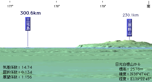 ※2000年6月に始まった火山活動により、雄山の山頂火口付近は崩れ落ちて低くなってしまいました。今ではもう、日光白根山−三宅島は見えないかもしれません。 噴火後の三宅島の地形については、国土地理院のウェブサイト「三宅・神津島のページ」を参照してください。