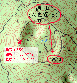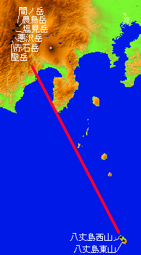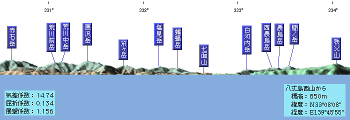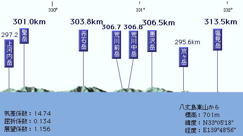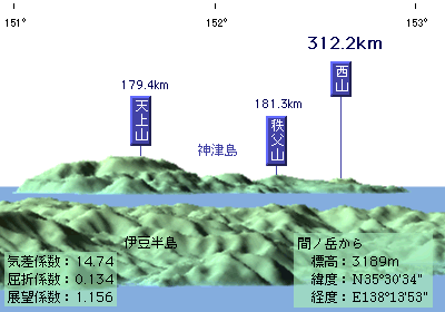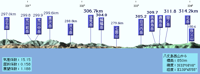 八丈島の西山山頂三角点からは南アルプスの間ノ岳まで、東山山頂三角点からは間ノ岳と農鳥岳は見えず塩見岳までを望むことができます。西山−間ノ岳が312.2km、東山−塩見岳が313.5kmです。