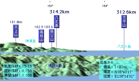 西山の火口の西側に回ると、気差係数15.15の条件なら、計算上は北岳が見えるようになります。距離は314.2kmで、これが八丈島からの最遠望になります。比較のため、通常の気差係数14.74で描いた展望図を下に並べました。気差係数15.15だと、北岳からは八丈小島の太平山も見えることになります。北岳からの八丈島は神津島の秩父山に重なってしまって、視認することはほとんど不可能でしょう。