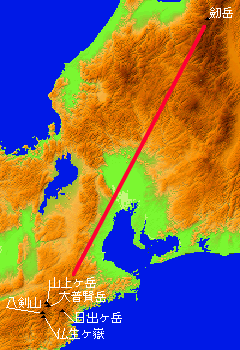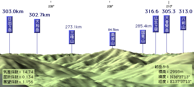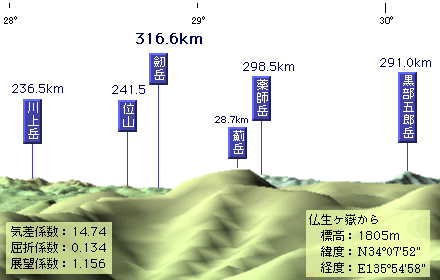 紀伊半島の大峰山地や大台ヶ原からは富士山を眺めることもできますが、距離は300kmに届きません。北アルプス北部の劒岳ならば、300kmを越えます。