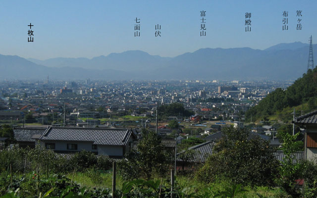 | 5 | 52km |  | 十枚山 | 甲府市 | 2004/10/01 | 2004/10 | Walstone | 今日は素晴らしい天気でしたね。山の上にいれば、相当な遠望が得られたでしょう。とりあえず、甲府盆地の北部から富士川谷の向こうに見える十枚山を写してみました。 |