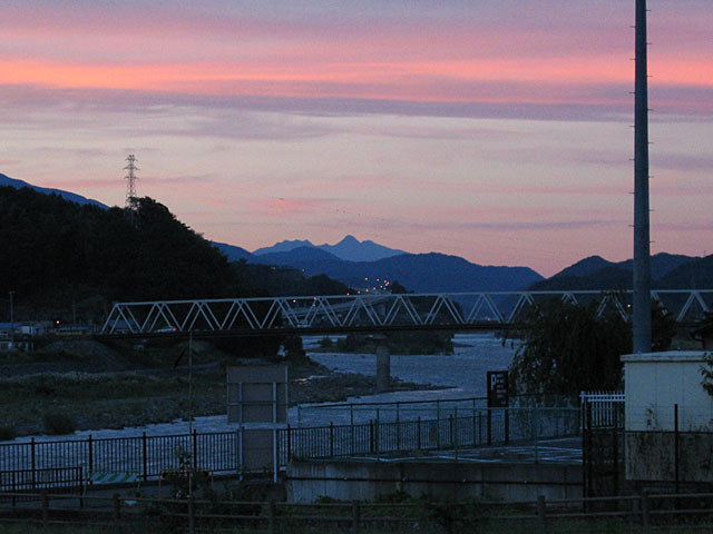 | 3 | 67km |  | 赤岳 | 身延駅付近 | 2004/10/16 | 2004/10 | Walstone | 写真の撮影地は、JR身延線の身延駅のすぐ南の駐車場でした。大きな川は富士川、橋は身延橋です。身延線が鰍沢から富士川の谷に入ってしまうと八ヶ岳は見えなくなってしまうと思うかもしれませんが、この身延駅付近からは写真のように見えるのです。 |