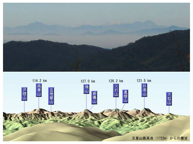 | 2 | 127km |  | 焼山 | 五里山 | 2004/10/16 | 2004/10 | Walstone | 標高1673mの三角点は林の中で展望は利きません。鞍部をはさんで南東に1722mの最高点があり、地元の須玉町ではこちらを五里山と呼んでいるようです。山頂は大きな岩で、これに登ると南アルプスと八ヶ岳のパノラマが広がります。八ヶ岳の右側、北方に妙高戸隠の山々が眺められました。ようやく100km超の遠望です。この写真の左手、八ヶ岳のすぐ右に白馬乗鞍岳が真っ白に見えました。北アルプスのほとんどは八ヶ岳に遮られて見えません。乗鞍岳、御嶽山、中央アルプスがわかりました。 |