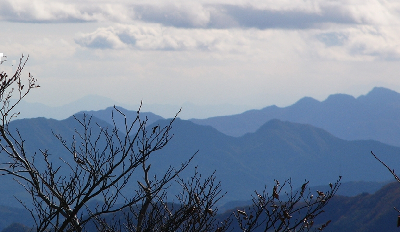 | 6 | 105km |  | 奥穂高岳 | 帯那山三角点付近 | 2006/11/25 | 2006/11 | Walstone | 土曜日は天気が良かったので、昼前に帯那山に行ってみました。林道に車を置いて山頂まで歩いて5分。富士山〜毛無山〜聖赤石悪沢〜塩見〜農鳥間ノ岳北岳〜甲斐駒のパノラマがくっきり。10分ほど歩いて山頂三角点へ。三角点付近は木立で展望は良くないのですが、木の間越しに八ヶ岳が見えます。その左の方に白い山が…。北アルプスでした。林の中を歩き回って薮と重ならない所を探して、何とか撮影。写真の左には霞沢岳も見えました。穂高と八ヶ岳の間の山は茅ヶ岳です。 |