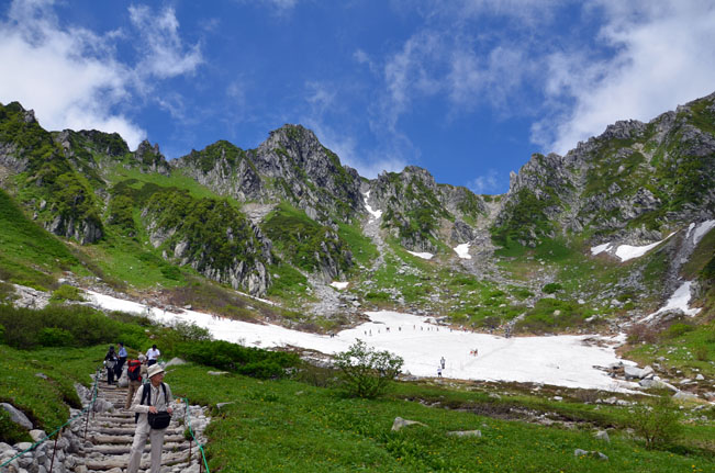 宝剣岳はガスの切れ間から時々見えていました。今年は雪が多いようで、高山植物も盛りとまではいきませんでした。 |