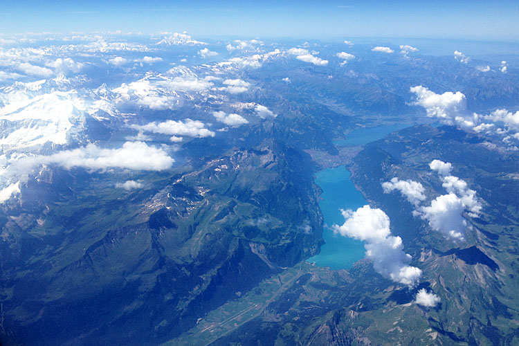 | 番外 | 約150km |  | モンブラン | スイス・グリンデルヴァルト北北東約40kmの上空 | 2014/07/17 | 2014/07 | Walstone Jr. | スイス・グリンデルヴァルト北北東約40kmの上空から南南西の眺めです。手前の湖はブリエンツ湖。その向こうの湖との間にインターラーケンの町。ブリエンツ湖の左に山を越えた平地がグリンデルヴァルト。その左にアイガーの北壁が見えています。左手遠方の高山はモンブランだと思います。 実はルール違反なのですが、この写真は、私ではなく現在パリに滞在中の息子が撮影したものです。パリからイタリアのミラノに飛んだときに写したそうで、先日メールで送られてきました。グーグルマップの衛星写真とにらめっこして山座同定をした次第。距離は、かなりアバウトです。今月は、山に行けそうもないのでピンチヒッターに頼ってしまいました。