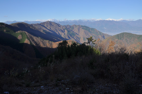 土曜日の早朝の下芦川行きは、客は当然ながら私一人。30分弱で下芦川について、地形図に破線が書かれている釈迦ヶ岳の北尾根に取りつく。ガイドブックにもネット上にも情報のないコースで、荒れていることも覚悟していたが、普通の山道だった。しばらく登ると、テレビ用のアンテナが立てられていて、南アルプスが眺められる。葉が落ちた尾根道も気持ちが良い。