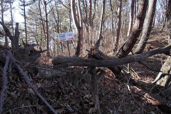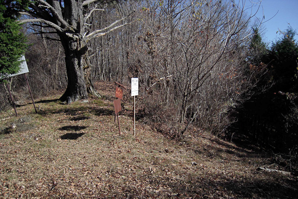 <釈迦ヶ岳〜蛾ヶ岳の尾根に合流>登ってきた旧道と釈迦ヶ岳西尾根との合流点.旧道への入口は木でふさがれていた. |
