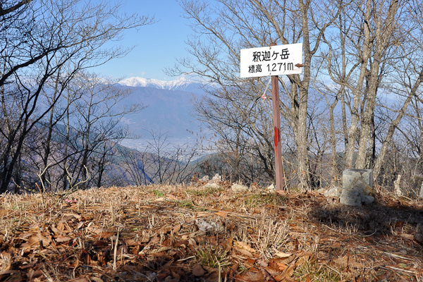 尾根道は、標高1,050m付近で林道折八古関線に切られてしまうが、林道のカーブを回り込んだ所に尾根に上がる踏み跡があった。上がった所は樹木が伐採されていて西方の眺めが良い。これから向かう蛾ヶ岳と、その向こうに南アルプスの山並みが連なる。踏み跡は、まっすぐ釈迦ヶ岳の山頂へは向かわず、少し右にそれて、釈迦ヶ岳の右肩で八坂峠から続く釈迦ヶ岳の西尾根に出る。西尾根の登山道から、今登ってきた方向には進入を遮るように木が渡してあった。西尾根に合流すれば釈迦ヶ岳の山頂はすぐだった。山頂は木立に囲まれて展望はあまり良くない。木々の間から白根三山が見える。南側に松葉林越しに富士が見えたのが意外だった。