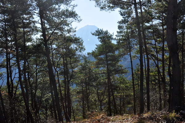<釈迦ヶ岳山頂からの富士>松の木の間から富士が見える. |