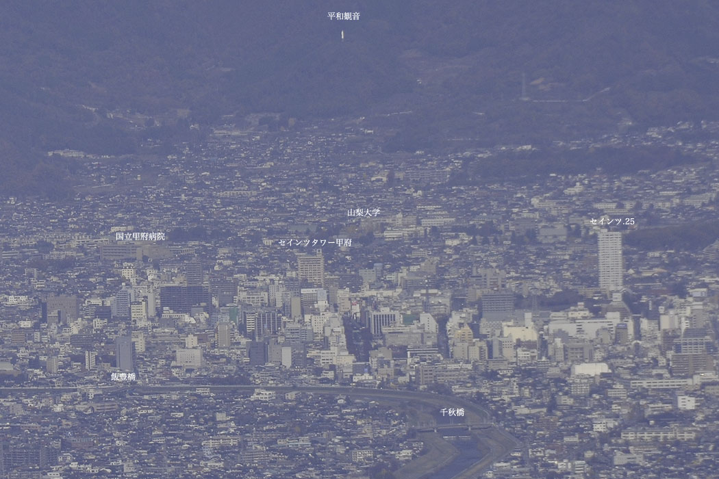 <蛾ヶ岳山頂からの甲府市街>蛾ヶ岳山頂から望遠レンズで見た甲府市街.大きなビルや平和観音が識別できる. |