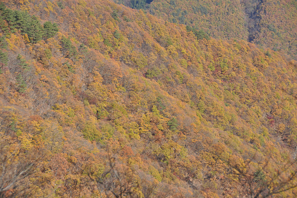 <山腹の紅葉>芦川流域の山腹は一面の紅葉.しかし、茶色っぽい。 |