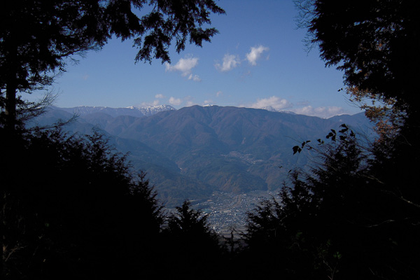 <四尾連峠から櫛形山と農鳥岳・間ノ岳>林の中で暗い峠だが、北西側が窓のように開けて南アルプスが見えた. |